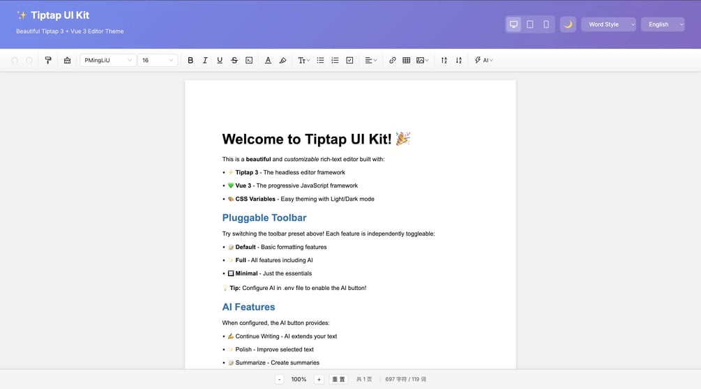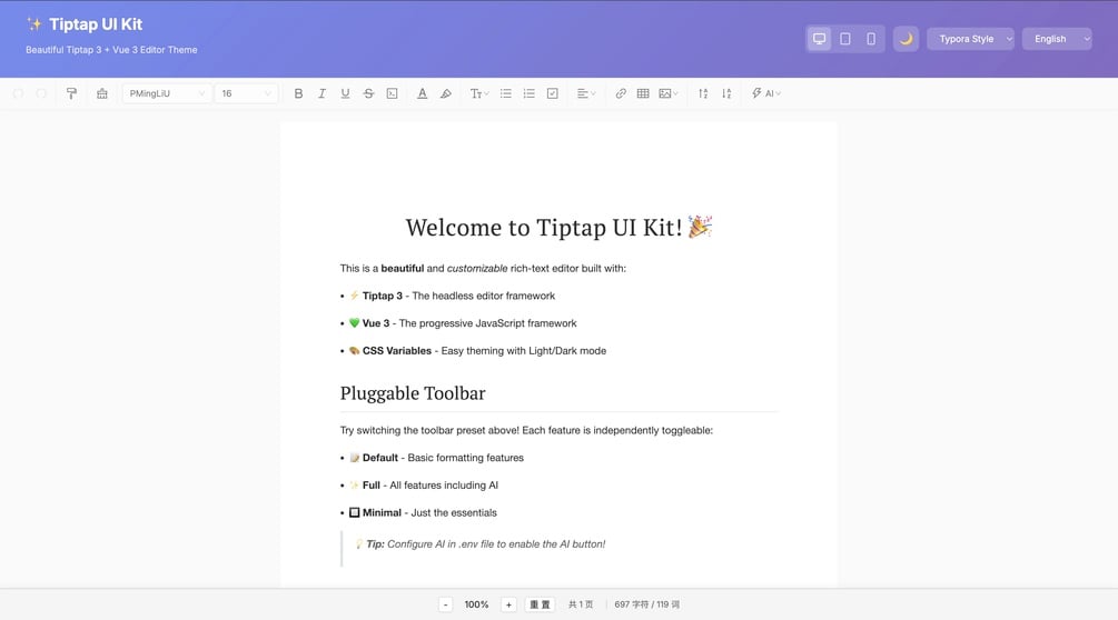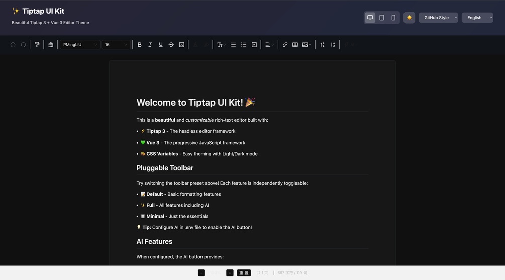 使用 ❤️ 和 TypeScript 构建 | 基于 Vue 3 和 Tiptap 3